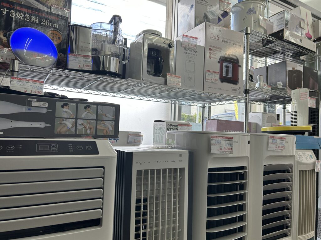 冬物の暖房器具だけでなく、棚には箱入りの小型家電もいろいろ並んでいます。
